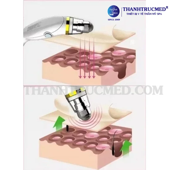 Cơ chế Mono RF (Radio Frequency đơn cực): Sóng RF tiếp xúc với bề mặt da, gặp nguồn điện sinh học trong cơ thể phát sinh nhiệt có ích từ 55°C - 65°C. Nhiệt lượng này giúp hàn gắn kết cấu Elastin và Collagen bị đứt gãy. Từ đó, kích hoạt hệ tuần hoàn, đào thải độc tố, tăng khả năng hấp thụ Oxy và khôi phục chức năng tế bào, giúp da căng mịn, đàn hồi và ngăn ngừa lão hóa toàn diện.