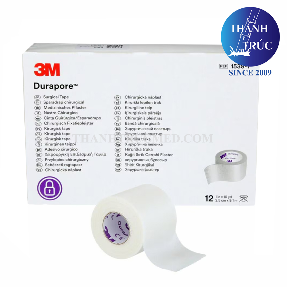 Băng keo y tế 3M Durapore 1538-1 Nền vải dạng lụa, phủ keo có độ kích ứng da thấp. Kích thước 2,5cm x 9,1m
