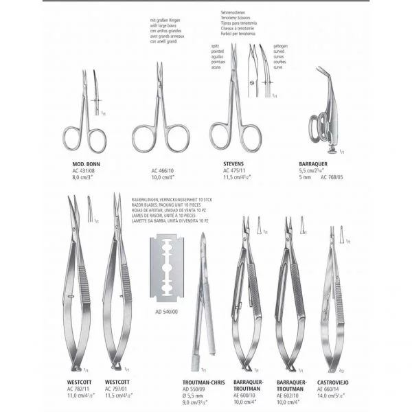 | 15 | Kéo phẫu thuật Barraquer 5mm-5.5cm | AC 768/05 | Cái | 1 |