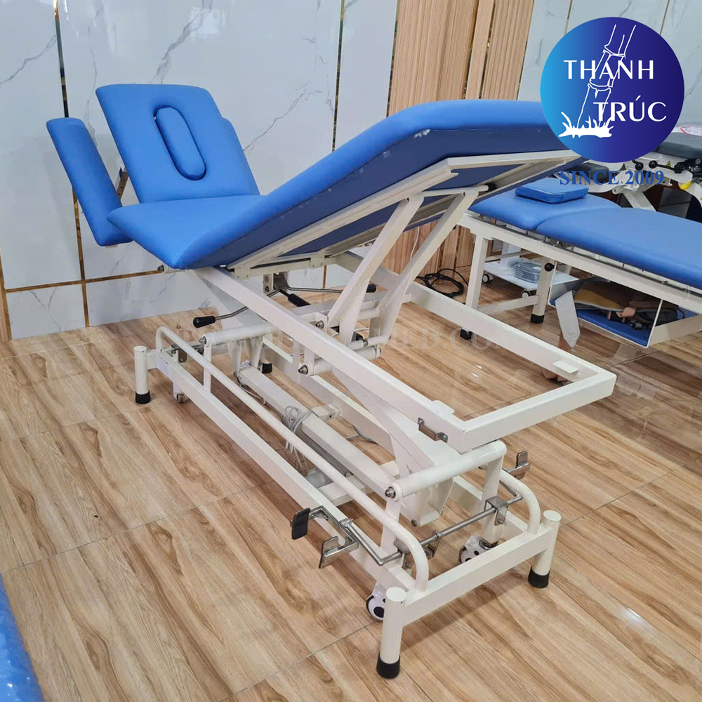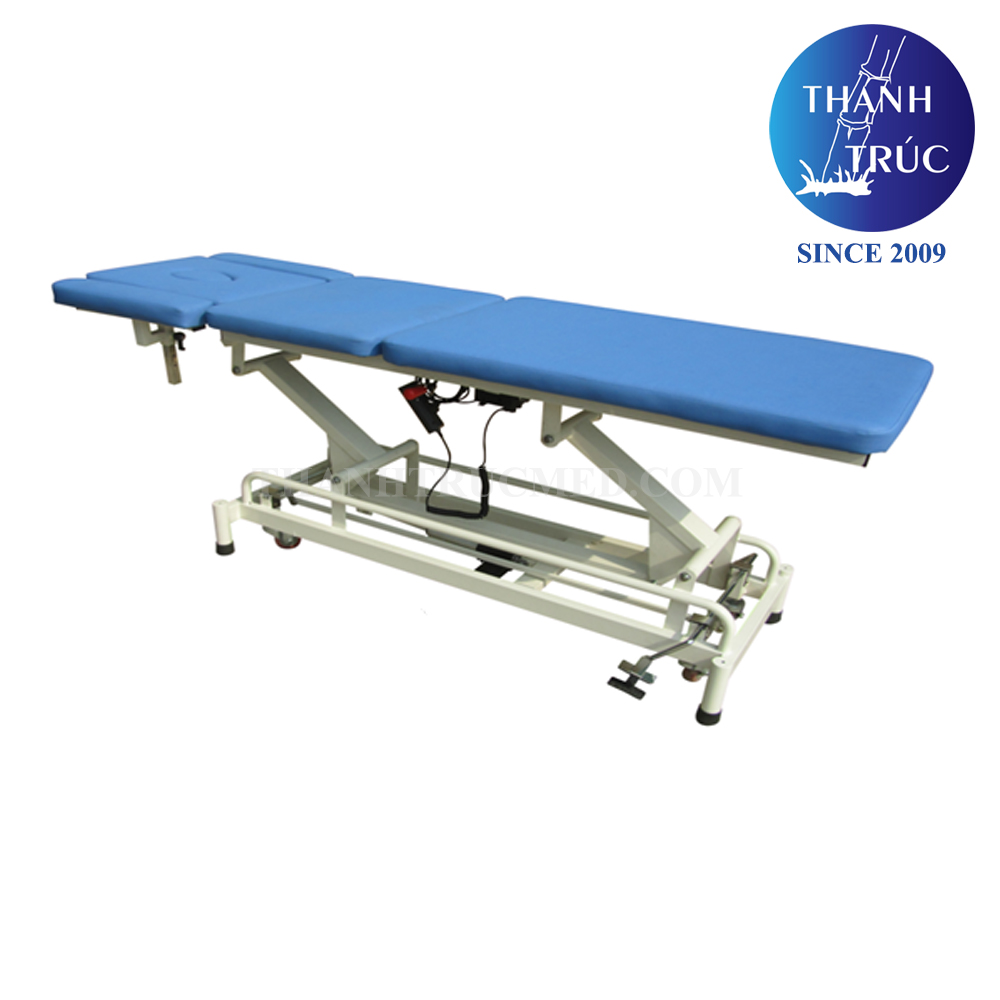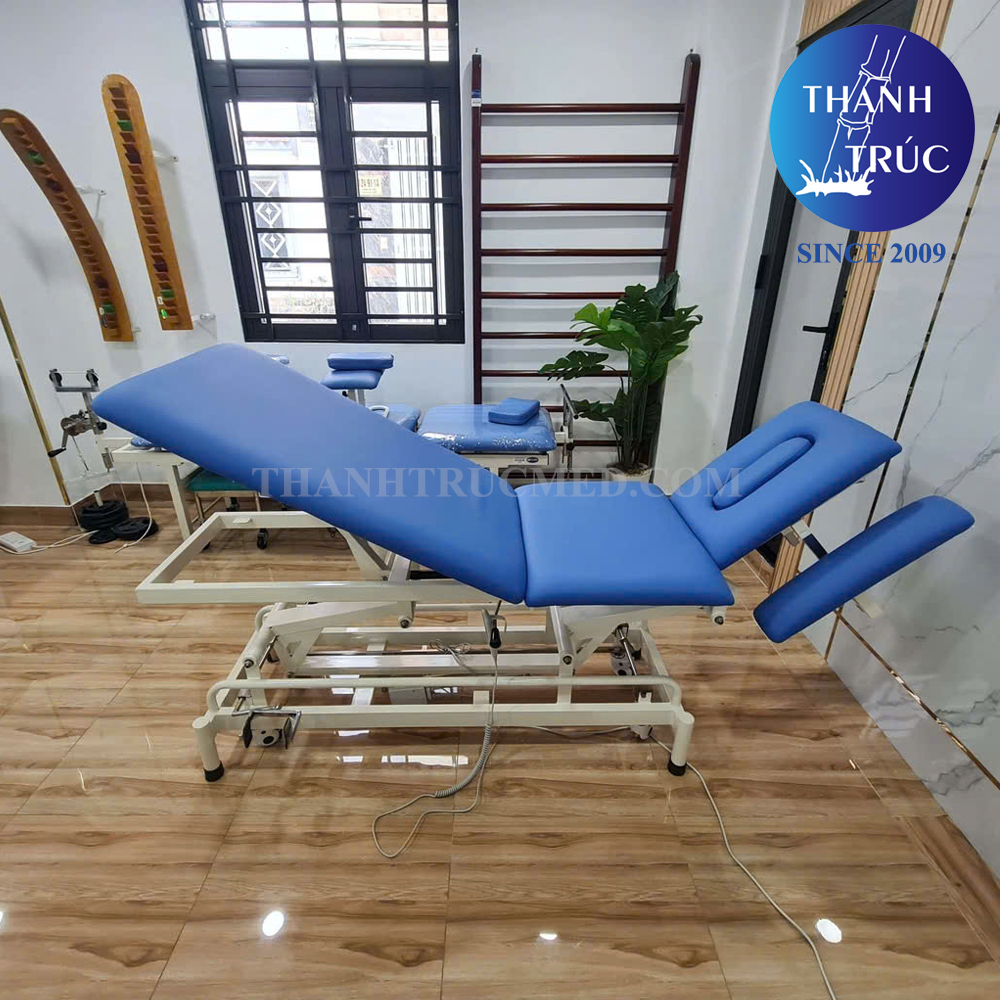 - Có các chức năng: Nâng đầu, nâng chân theo góc độ yêu cầu. Đặc biệt một phần đầu giường có thể hạ thấp để áp dụng các kỷ thuật kéo dãn các khớp và đầu giường có lỗ để thực hiện các phương pháp điều trị ở tư thế nằm sấp mà không làm người bệnh khó chịu.