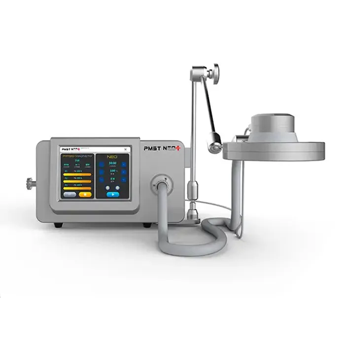 Máy điều trị từ trường kết hợp laser lạnh PMST Neo+ là phiên bản cao cấp hơn của PMST 5 NEO sử dụng laser lạnh với bước sóng 650nm hoặc 808nm thay vì dùng hồng ngoại. Điều này giúp máy có thể tác động sâu hơn, hiệu quả hơn so với phiên bản thông thường. Ngoài ra, máy có mức công suất từ trường siêu dẫn lớn hơn (5 Tesla) cùng hệ thống tản nhiệt nước và công suất tối đa máy lên đến 1500W giúp cho PMST 5 NEO+ là lựa chọn rất đáng đầu tư trong phân khúc máy từ trường 2 trong 1.