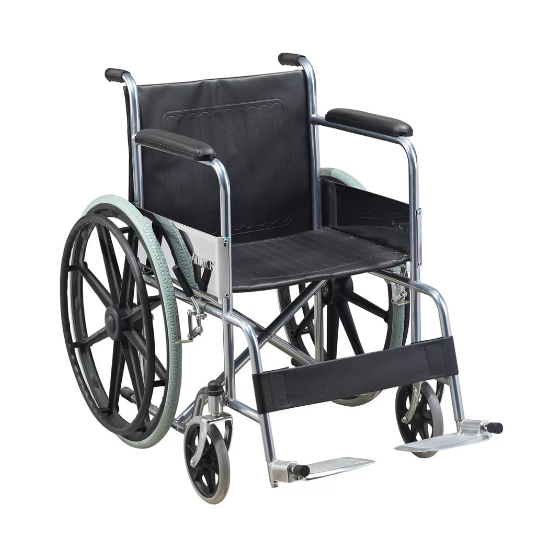 Xe lăn tay AOLIKE ALK-809B với phần khung bằng thép phủ nano, tựa tay và chân cố định, bánh xe sau dạng đúc bằng PU, bánh trước bằng nhựa PVC.