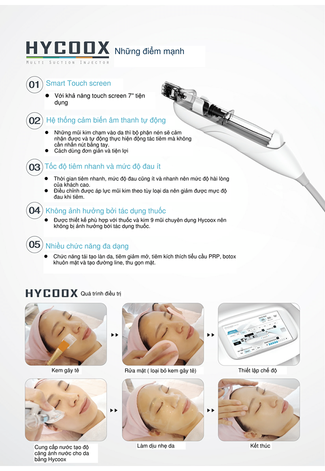 - Với cơ chế hoạt động thông minh, tự động hóa tối đa, máy tiêm dưỡng chất HYCOOX không chỉ nâng cao hiệu quả điều trị mà còn giúp spa tiết kiệm thời gian, tối ưu hóa quy trình chăm sóc da chuyên nghiệp.