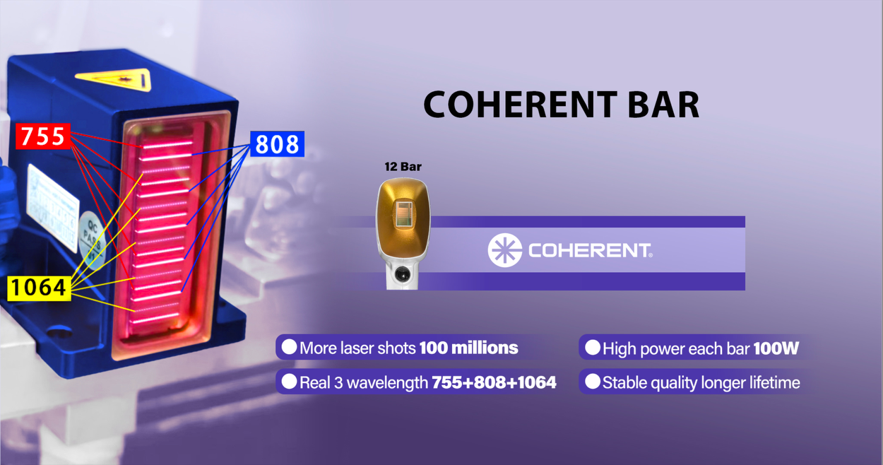 Máy triệt lông Diode Laser Himedi sử dụng thanh laser COHERENT nhập khẩu từ Mỹ, mỗi thanh công suất 100W, tổng 12 thanh laser.