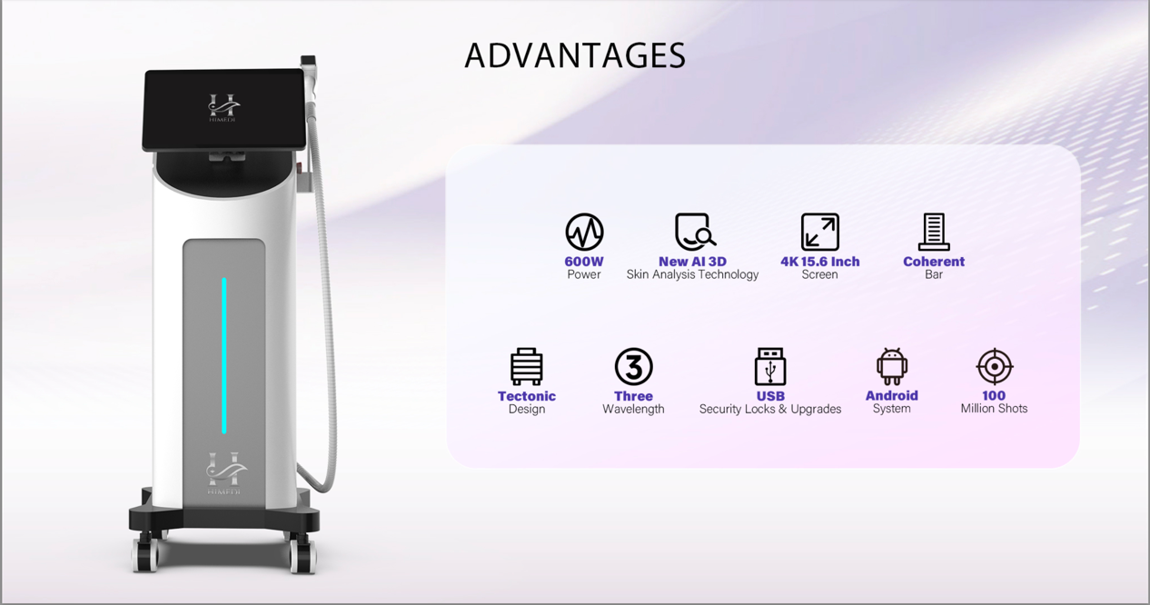 Máy triệt lông Diode Laser Himedi tích hợp 3 bước sóng 755–808–1064nm, AI Skin Analyzer 3D và hệ thống làm mát -42°C. Giải pháp triệt lông hiệu quả, an toàn, tối ưu vận hành cho spa chuyên nghiệp.