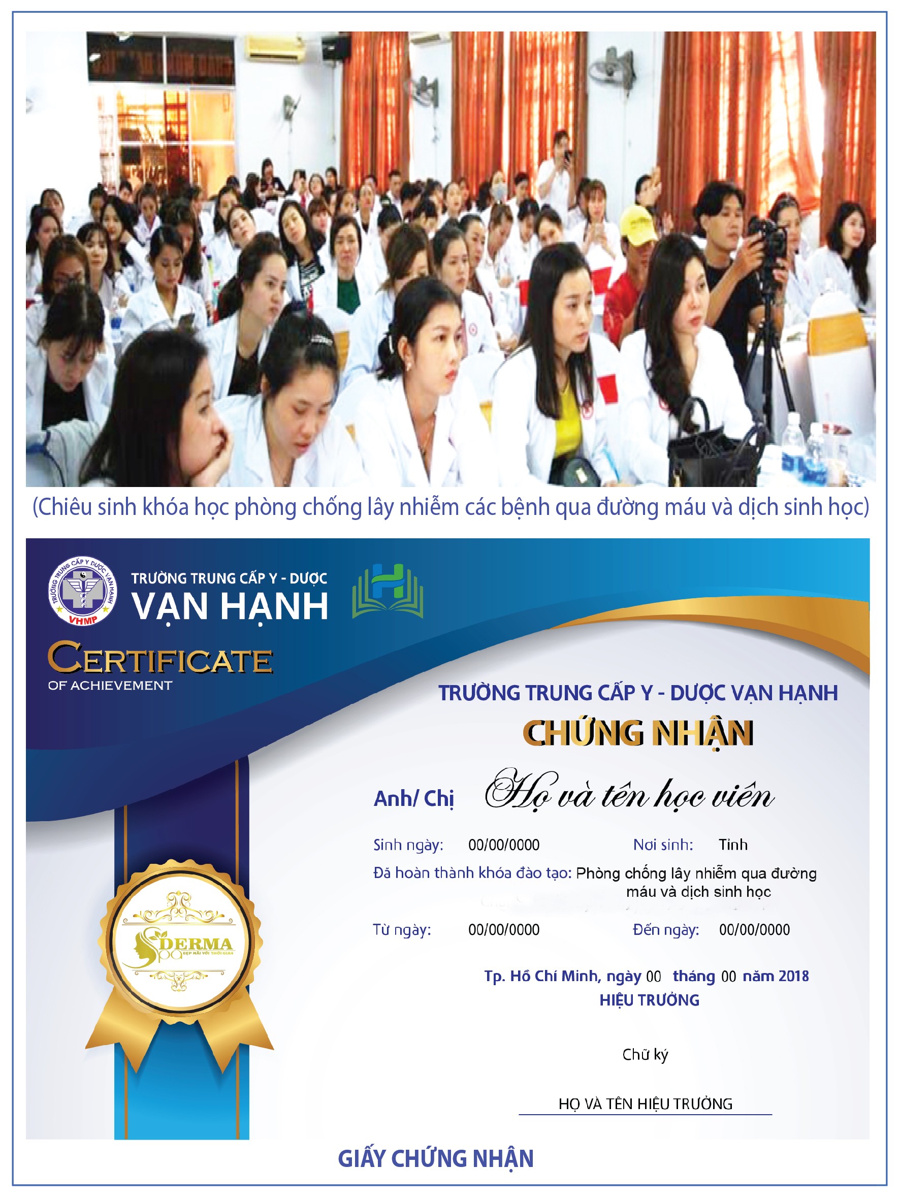 Nhằm trang bị CÁC KIẾN THỨC CŨNG NHƯ BIỆN PHÁP PHÒNG CHỐNG BỆNH QUA ĐƯỜNG MÁU VÀ DỊCH SINH HỌC cho học viên tại các lớp tại học tại trường đào tạo thẩm mỹ Derma cũng như các bạn đang làm nghề trong lĩnh vực chăm sóc sắc đẹp như: