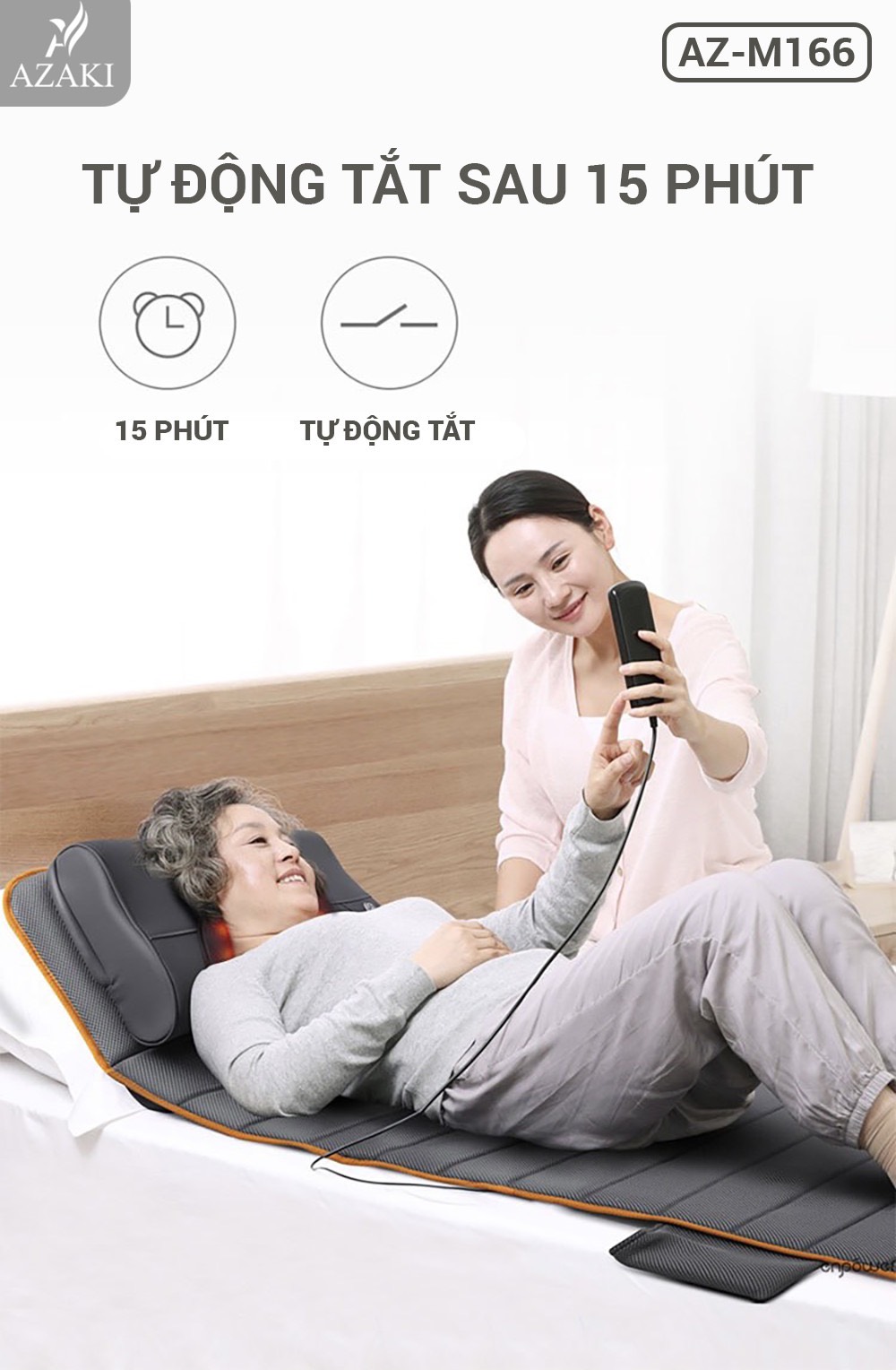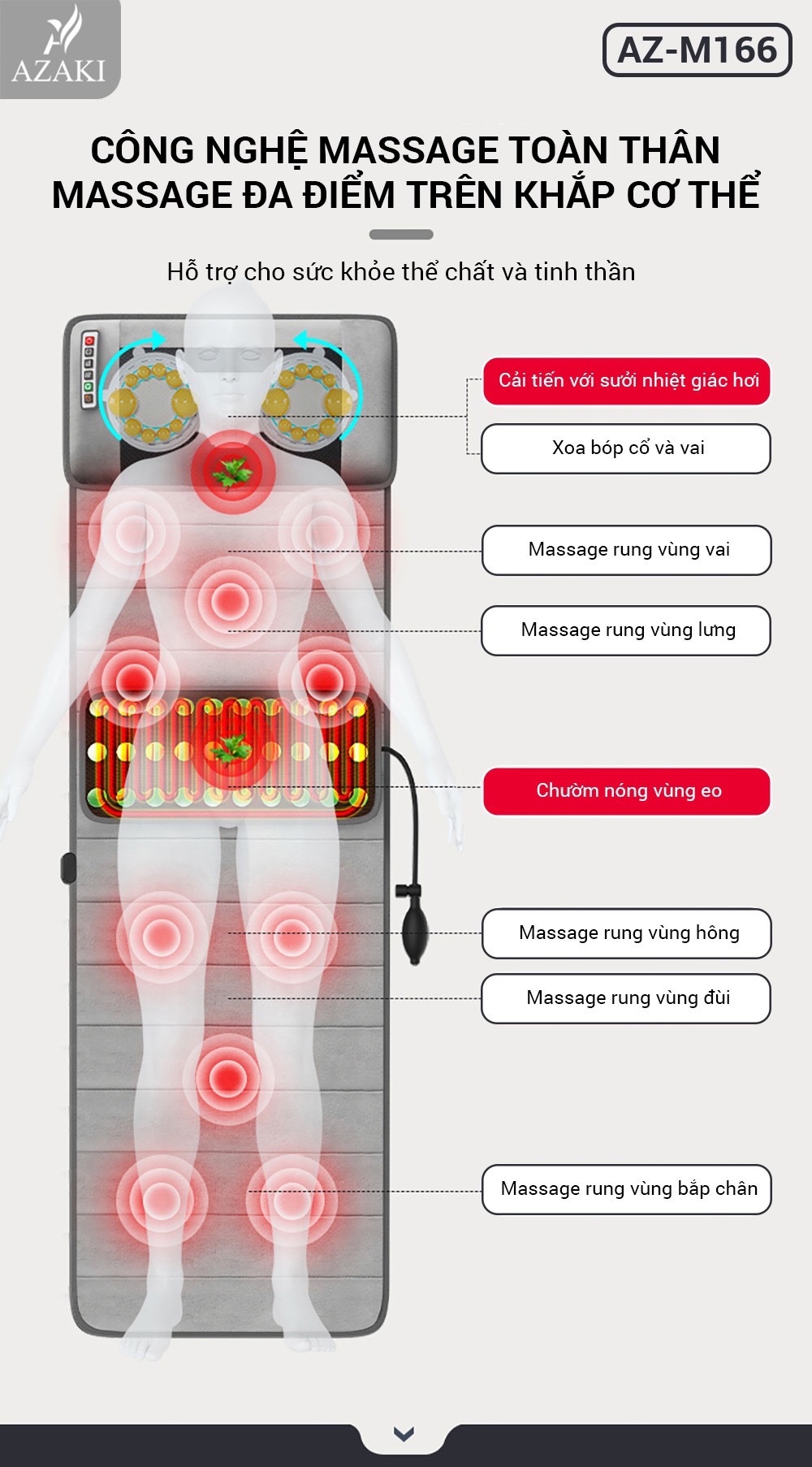 + Đệm massage thư giãn Azaki M166 hỗ trợ giảm đau nhức toàn thân, giúp tăng lưu thông khí huyết, thư giãn tinh thần, đem lại giấc ngủ ngon và sâu.
