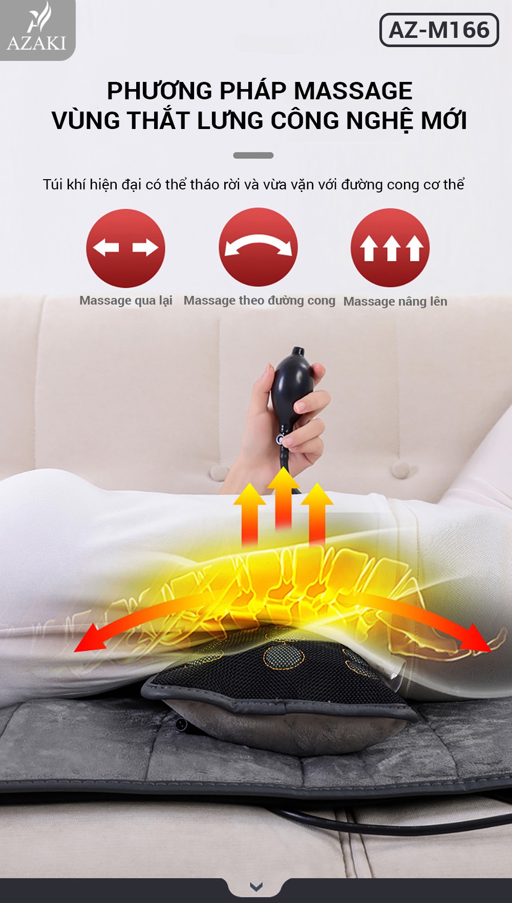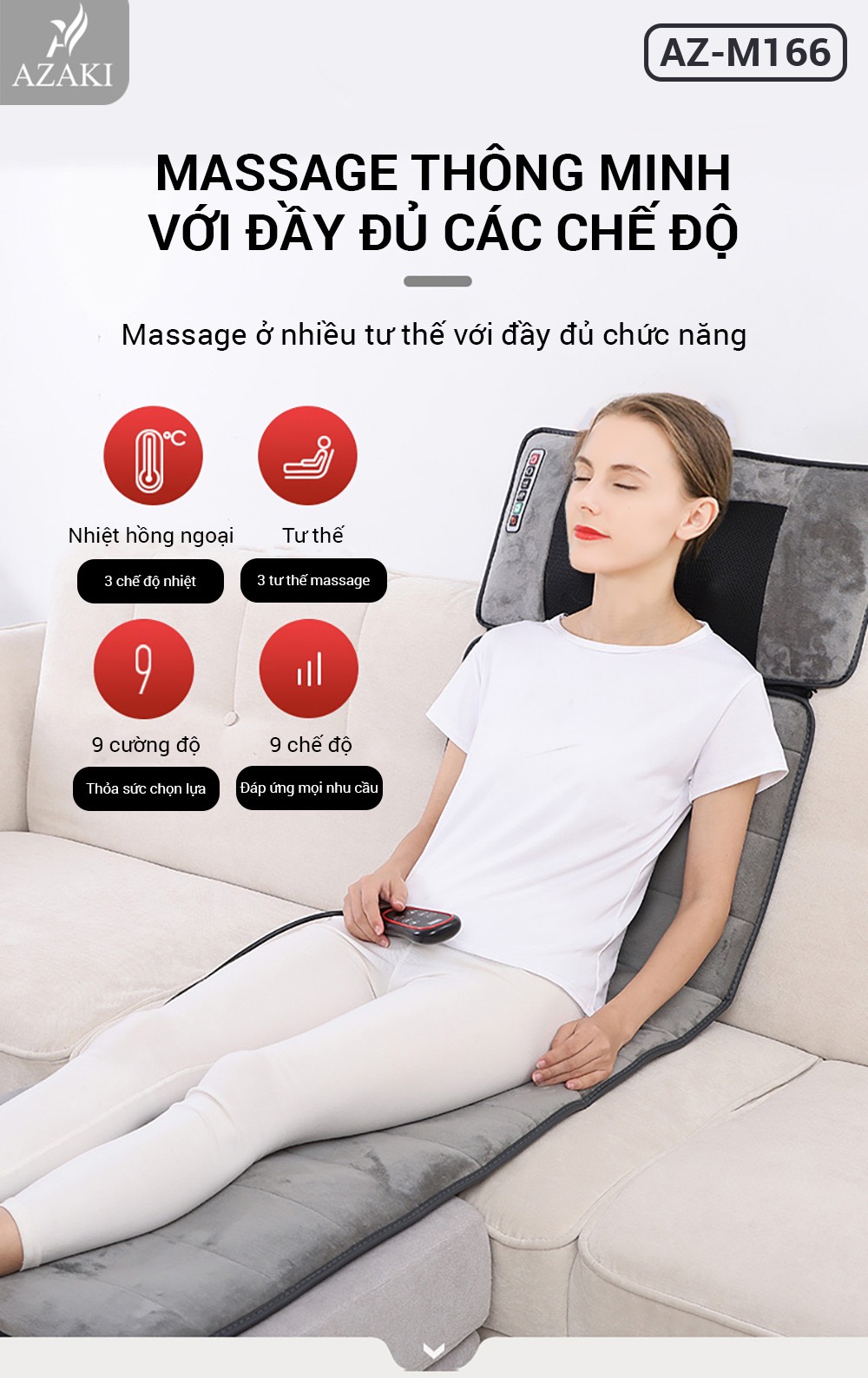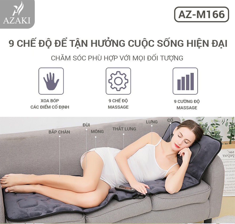 + Đệm massage thư giãn toàn thân Azaki M166 có nhiều chế độ massage đa dạng: