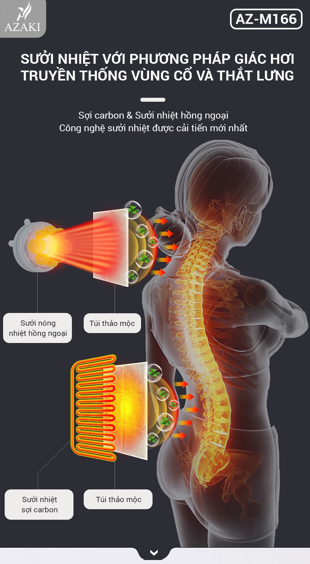 - Chế độ sưởi ấm bằng nhiệt hồng ngoại kết hợp túi chườm thảo dược vùng cổ và thắt lưng.
