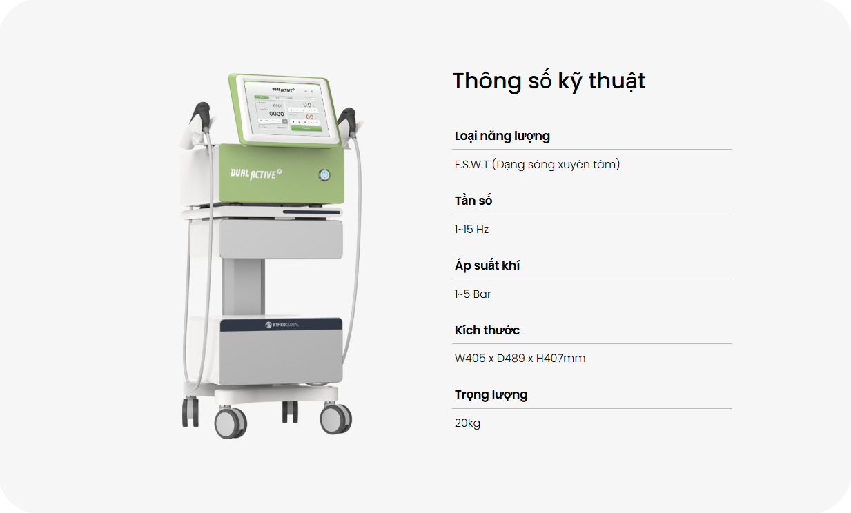 Dual Active R ứng dụng công nghệ sóng xung kích ngoài cơ thể (radial extracorporeal shockwave) nhằm hỗ trợ điều trị đau cơ xương khớp, phục hồi mô tổn thương và cải thiện tuần hoàn máu hiệu quả, thiết bị này điều trị không xâm lấn, không gây tổn thương các mô da.