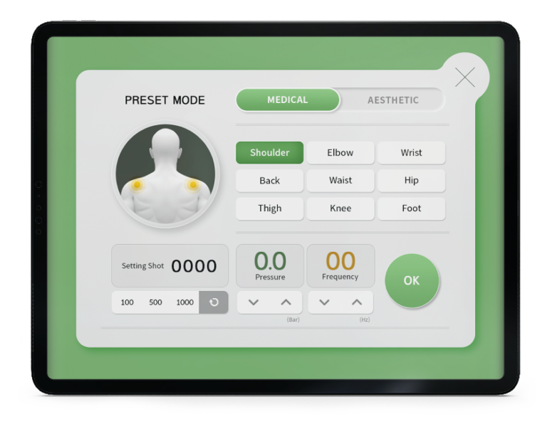 Thiết bị đi kèm ba đầu điều trị với độ sâu khác nhau, phù hợp để áp dụng cho các rối loạn cơ xương khớp như vai, thắt lưng, đầu gối và bắp chân.