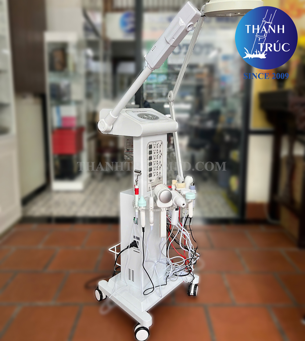 Công dụng: soi da, xông hơi, lấy mụn, điện tím, tiệt trùng UV, đốt mụt rùi, tẩy vết nám, điện di, siêu âm da,..