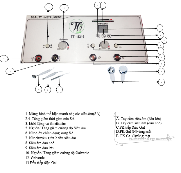 Bộ máy TT-8016 bao gồm: thân máy và 2 đầu siêu âm và 3 đầu Galvanic,