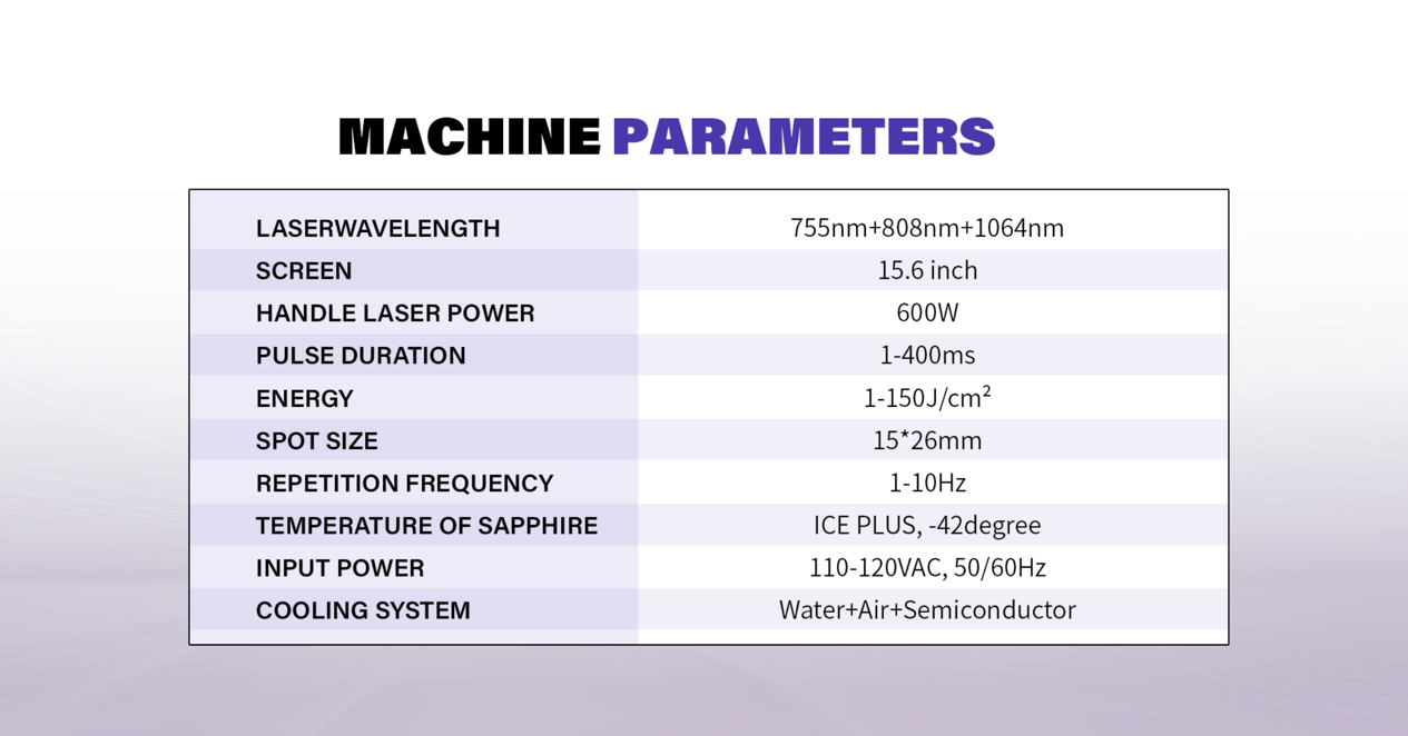 Với ba bước sóng 755nm + 808nm + 1064nm, máy đảm bảo khả năng triệt lông vĩnh viễn cho mọi loại da và vùng cơ thể khác nhau – từ da sáng đến da ngăm, từ lông mảnh đến lông cứng.